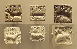 - Die Reifezeit, „Mature Harappan“, im Zeitraum 2600–1900 v. u. Z., weist eine Standardisierung der viereckigen Bildsiegel auf, die hier verschiedene Tiere zeigen. Bekannt sind Bullen, Wasserbüffel, Elephanten, Nashörner und das Einhorn. Der Abdruck findet sich nun auch als Ornament auf Stühlen und Tellern, oder das Bild ist eingemeißelt in Steine oder Metalle.
