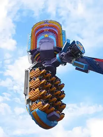Aus der Podiumskonstruktion, welche zum Ein- und Aussteigen dient, ragt ein um 45° nach vorne geneigter Mittelmast empor, an dessen oberem Ende ein 22 m langer Arm drehbar befestigt ist. An einem Ende trägt der Arm die Gondel, die motorisch um die Längsachse des Arms und freischwingend um ihre eigene Längsachse jeweils um volle 360° drehbar ist. In der Längsachse ist die Gondel zweigeteilt; die beiden Hälften können sich unabhängig voneinander um die Längsachse überschlagen. Das andere Ende des Arms trägt ein Gegengewicht. Um der Gondel die nötige Bewegungsfreiheit zu geben, wird das Einstiegspodium vor Fahrtbeginn pneumatisch abgesenkt.