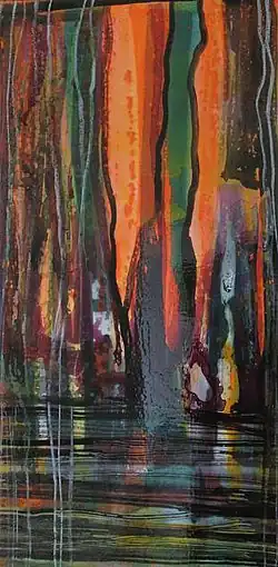 Eine grün-bläuliche Fläche von rosa Balken wie eingerahmt. Dunkle Streifen rinnen über die Leinwand, die mit Lack versiegelt ist und wie ein Spiegel wirkt. Man möchte es anfassen, dieses Bild, es wirkt auf eigenartige Weise greifbar. (Verena Patel, Rheinische Post)[5]