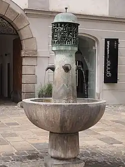 • Brunnen Landhausplatz mit vier Wasserspeiern, Runde Granitschale, aus deren Mitte ein sich verjüngender Säulenschaft ragt. Dieser wird von einem Figurengitter aus Bronze bekrönt, das Marktszenen darstellt, Linz, 1967[2]