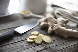 Der Ingwer-Wurzelstock enthält einen zähflüssigen Balsam (Oleoresin), der aus ätherischen Ölen und einem Scharfstoffanteil, den Gingerolen und Shogaolen, besteht. Zubereitungen aus dem Ingwer-Wurzelstock werden antioxidative, antiemetische, entzündungshemmende sowie anregende Effekte auf die Magensaft-, Speichel- und Gallenbildung sowie die Darmfunktion zugesprochen und daher insbesondere in der traditionellen asiatischen Medizin auch zur Behandlung von Rheuma, Muskelschmerzen oder Erkältungen verordnet.[25] Die Kommission E und die European Scientific Cooperative on Phytotherapy (ESCOP) befürworten die Anwendung von Ingwerwurzeln bei Magen-Darm-Beschwerden und gegen Übelkeit.[26]