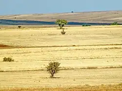 Südlich der Sivrihisar Dağları geht das Porsuk-Sakarya-Gebiet in die Obere Sakarya-Senke über, dort liegen die Emir Dağları und im Osten die Schwelle von Cihanbeyli. Hier handelt es sich um den klassischen Fall einer für Inneranatolien typischen Steppentafel mit Verbindungen im Norden zum Porsuk-Tal und im Süden zum Becken von Konya. Die Obere Sakarya-Senke wird von ungestörten, flachlagernden lakustrischen Sedimenten des Miozäns gebildet, die vermutlich auf kristallinem Untergrund liegen. Die Sedimente dieses Beckens wurden in der alten Literatur noch dem unteren Pliozän zugeordnet. Nach neueren Erkenntnissen sind sie ins obere Miozän zu stellen.[44] Diese neogene Tafel mit Höhen um 950 m wurde vom Sakarya und seinen Nebenflüssen zerschnitten. Die Oberfläche des Plateaus stimmt im zentralen Teil mit einem altpliozänen Seeboden überein. Am Fuß der umrahmenden Gebirge schneidet sie als Skulpturfläche die Sedimente des Grundgebirges. Dadurch hat sich rings um die neogene Platte ein mittel- und jungpliozänes Fußflächensystem ausgebildet.[45] Das lokale Klima wird bestimmt von heißen, trockenen Sommern und kalten, relativ trockenen Wintern. Die jährliche Niederschlagsmenge liegt im Durchschnitt deutlich unter 400 mm. Die Vegetation besteht ausschließlich aus Steppenformationen, und auch die hydrologischen Gegebenheiten stehen in eindeutiger Abhängigkeit vom Niederschlag und vom Grundwasser. Im westlichen Teil des Gebietes gibt es Karstquellen, die als Ursprung des Sakarya gelten. Im Osten, in der Gegend von Akgöl, hängt der Wasserhaushalt allein von den Niederschlägen ab, weshalb nur periodische und episodische Abflüsse zu verzeichnen sind.