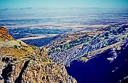 Östlich des Tuz Gölü-Beckens begrenzt das mittlere Kızılırmak-Tal über lange Strecken weit nach Norden die Landschaften des östlichen Inneranatolien bis zum Südfuß des Pontischen Gebirges bei Çankırı und teilt in etwa ab der Höhe des Hirfanlı-Stausees bei Kırşehir ostwärts das Östliche Inneranatolien in einen südlichen und einen nördlichen Teil, wobei der Kızılırmak den Nordteil, die Bozok Yayla, in einem großen Bogen, dem sogenannten „Halys-Bogen“ (nach dem antiken Flussnamen des Kızılırmak) umrahmt. Die Ostgrenze des Östlichen Inneranatolien verläuft am Westfuß des Akdağ-Massivs (Akdağlar), während im Süden das Taurus-Gebirge und im Norden das nordanatolische Gebirge die Grenzen bilden. Der Charakter der Landschaft wird von weitgespannten Hochflächen mit Höhen um 1200–1400 m bestimmt, die von tief eingesenkten Tälern zerschnitten und von einzelnen Bergstöcken überragt werden, die zwischen 1500 und 1700 m Höhe erreichen. Während die Berggebiete Reste von Trockenwäldern tragen, breitet sich auf den Plateaus Steppenvegetation aus, denn die Sommer sind trocken und relativ kühl, die Winter bereits sehr kalt. Südlich vom großen Bogen des Kızılırmak, im Umfeld der kappadokischen Riesenvulkane Erciyes Dağı und Hasandağı, im 1200 bis 1500 m hohen Tuffhochland von Nevşehir liegen mächtige vulkanische Tuffserien auf älteren Gesteinen, die von einer gewaltigen frühpliozänen Vulkantätigkeit herrühren und in die bereits Hethiter Höhlen und später frühchristliche Mönche Klöster und Höhlenkirchen mit Freskenbemalung eingearbeitet haben.[67]