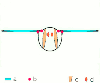 Die Kontraktionen der Muskelzellen verlaufen anders als bei Muskelzellen üblich, da die Myosinköpfchen durch eine Konformationsänderung zwar umknicken, sich jedoch nicht vom Aktin ablösen, um an einem weiteren Aktinabschnitt neu anzusetzen („biologisches Zahnrad“ der Muskeln). Daher ist die Verkürzung des Flugmuskels extrem gering und muss durch eine mechanische Übersetzung auf den Flügel übertragen werden. Diese Übersetzung wird unter anderem durch eine Kette von einarmigen Hebeln erreicht, indem die Kraft vom vorderen Teil des Thoraxrückens, dem Scutum, auf den hinteren Rückenteil (Scutellum) übertragen wird, um von dort über die auf beiden Seiten am Scutellum ansitzenden Tergalhebel wieder nach vorne zu den Flügelgelenken gebracht zu werden.