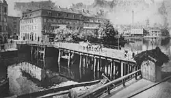 Im Jahre 1693 entstand im Zusammenhang mit der ersten Entwicklung von Alt-Kölln an der heutigen Stelle eine mehrfeldrige hölzerne Jochbrücke mit einem Klappendurchlass für die Schifffahrt. In einem amtlichen Brückenverzeichnis des Jahres 1709 trug sie den Namen „Brücke vom Cöllnischen Wursthofe über den Kanal nach Neu-Cölln“.[2] Mehrfach repariert diente die nur circa 5 m breite Brücke rund 200 Jahre als wichtige Flussquerung im Stadtgebiet. Mit dem Ausbau des Mühlendamms verlagerte sich der Hauptschifffahrtsweg auf den nördlichen Spreearm und so konnte zu Beginn des 20. Jahrhunderts der Neubau einer festen und breiteren Brücke in Angriff genommen werden. Ludwig Hoffmann, der gerade die benachbarte Roßstraßenbrücke fertiggestellt hatte, lieferte die neuen Baupläne für eine steinerne Bogenbrücke.