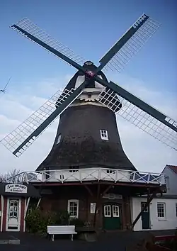 Der Achtkant und die Kappe sind als einziges Gebäude der Insel Norderney mit Reet gedeckt.[5] Die Windrose oberhalb der Rückseite der Mühlenkappe dient der Flügelnachführung und dreht die Kappe mit den segelbespannten Flügeln über ein Zahnradwinkelgetriebe in den Wind. Unterhalb der Windrose ragt der Bremsbalken heraus (mit Fuchs), mit dem die Bandbremse am Kammrad zur Abbremsung bzw. Feststellung der Flügelachse betätigt werden kann.[8] Nachdem ein Flügel im März 1951 aufgrund eines Sturmes gebrochen war, brannte die Mühle nach Reparaturarbeiten an der Blitzableiteranlage am 24. April desselben Jahres völlig nieder. Die Norderneyer Feuerwehr löschte den Brand und konnte eines der Wahrzeichen der Insel vor der kompletten Vernichtung retten.[9] Da die Mühle von der Familie Fleetjer ausreichend feuerversichert war, konnte sie aus diesen Mittel einigermaßen wiederhergestellt werden. Der Mühlenbetrieb konnte schon wenige Tage nach dem Brand wieder aufgenommen werden.[2][7][10][11] Im Jahr 1965 begannen Restaurierungsarbeiten durch den Mühlenbauer Hermann Böök aus Dunum in Ostfriesland.[12] Diese Umbauarbeiten umfassten auch den Ausbau des Erdgeschosses mit dem noch heute in der Mühle befindlichen Gastronomiebetrieb.