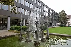 Nachdem 1946 der langjährige Institutshausmeister und Fotograf Anton Heppler als „Belasteter“ der NS-Zeit entlassen worden war, konnte das Institut den renommierten Archäologiefotografen Hermann Wagner gewinnen, der bis 1961 am Institut blieb und dabei bis 1953 auch Hausmeistertätigkeiten übernahm und nebenbei als Restaurator für Metallobjekte wirkte. Das erste große Ereignis nach dem Krieg war das hundertjährige Jubiläum des Antikenmuseums, das 1948 mit einer Sonderausstellung, einem dazugehörigen Katalogband („Die Welt der Griechen“),[10] einer Aufsatzsammlung zu Exponaten des Antikenmuseums („Ganymed – Heidelberger Beiträge zur antiken Kunstgeschichte“),[11] einer Vortragsreihe (publiziert 1950 unter dem Titel „Vermächtnis der antiken Kunst“)[12] und einem Festakt begangen wurde. Herbig verbrachte dazu die im Krieg eingelagerten Bestände wieder in die Institutsgebäude und schuf die feste Stelle eines Institutsfotographen, die mit dem schon angestellten Wagner besetzt wurde. In der Forschung zeigte er sich nun betont unpolitisch und versuchte in der Lehre an die Zeit vor 1933 anzuknüpfen, unter anderem durch eine große Italien-Exkursion 1951. Nach seiner Berufung zum Direktor des Deutschen Archäologischen Instituts Rom 1956 vertrat Bernhard Neutsch den Lehrstuhl eineinhalb Jahre, bis Roland Hampe die Professur übernahm. Unter ihm waren die Ressourcen für eine bedeutende Erweiterung des Instituts vorhanden, unter anderem durch den Abriss des Weinbrennerbaus und den Bau des Neuen Kollegiengebäudes[13] an dessen Stelle, in dem neben dem Institut ab 1971 auch Abgusssammlung und Antikenmuseum untergebracht werden konnten.[14] 1960 wurde dafür der Posten eines Restaurators, 1963 auch der eines Konservators (bis 1992 Hildegund Gropengiesser, 1992–2017 Hermann Pflug) geschaffen. 1968 wurde Jörg Schäfer als Dozent eingestellt, woraus ein Jahrzehnt später die zweite Professur des Instituts erwuchs. Schäfer beschäftigte sich auch mit als abseitig betrachteten Themen wie antiken Häfen und wandte neuartige Herangehensweisen beispielsweise der Geoarchäologie an. Aber auch Hampe richtete in seiner Forschung den Blick auf wenig erschlossene Bereiche, kulturgeschichtliche Fragestellungen und innovative Methoden. Seine Arbeitsschwerpunkte waren die Darstellungen griechischer Mythen (so wurde 1972 eine Arbeitsstelle des Lexicon Iconographicum Mythologiae Classicae in Heidelberg eingerichtet) sowie das antike Handwerk, welches er in Zusammenarbeit mit dem Experimentalarchäologen Adam Winter und anderen Kunsthandwerkern sowie Naturwissenschaftlern intensiv untersuchte.[15]