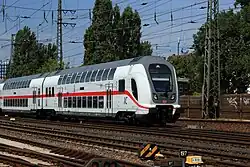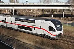 Seit dem 12. Dezember 2015 verkehren auch Doppelstockzüge unter dem Namen „Intercity 2“ (IC 2). Dazu wurden 135 neue Bombardier-Twindexx-Doppelstockwagen und 27 Lokomotiven der Baureihe 146.5 bei Bombardier Transportation bestellt.[27] Die Doppelstockwagen, die aus einem Regionalverkehrs-Rahmenvertrag stammen, sind allerdings nur für 160 km/h zugelassen.[28] Die Intercity-2-Züge verfügen über kein Bistro oder Restaurant, stattdessen erfolgt auf einzelnen Streckenabschnitten eine Bewirtung am Platz. Unter dem Namen IC Café-Team bieten Mitarbeiter von LSG Sky Chefs den Reisenden Kalt- und Heißgetränke, Snacks und Backwaren an.[29] Allerdings stießen die neuen Züge unter anderem wegen ihrer Laufeigenschaften – vor allem im Oberdeck wurden die Schwankungen als sehr massiv empfunden – auf heftige Kritik bei vielen Fahrgästen, so dass ab Ende Januar 2016 in den Werkstätten Nacharbeiten erfolgen sollen.[30]