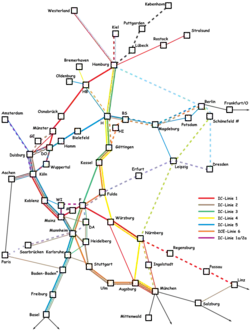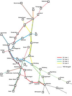- Linie 1 (rot): Hamburg-Altona – Bremen – Münster – Dortmund – Essen – Duisburg – Düsseldorf – Köln – Bonn – Koblenz – Mainz – Mannheim – Heidelberg – Stuttgart – Ulm – Augsburg – München
