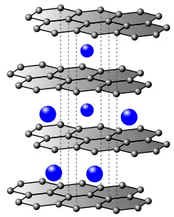 In der Anorganischen Chemie bezeichnet Interkalation die Einlagerung von Atomen, Ionen oder kleinen Molekülen zwischen die Kristallgitterebenen von Schichtkristallen, zum Beispiel die Interkalation von Alkalimetallen in Graphit (siehe Bild). Graphit und Silicium werden auf diese Weise als Träger von Lithium-Ionen in Lithium-Ionen-Akkumulatoren verwendet.[1] Die dabei entstehenden Verbindungen werden als Interkalationskomplexe bezeichnet.