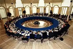Horst Teltschik, ehemals außenpolitischer Berater Helmut Kohls, übernahm im Jahr 1991 die Geschäftsführung der Bertelsmann Stiftung. Unter seiner Führung wurden die internationale Verständigung und insbesondere die europäische Integration zu Schwerpunkten der Stiftungsarbeit. Als ein herausragendes Projekt in diesem Bereich etablierte man 1992 das International Bertelsmann Forum.[1] Die Veranstaltung bot Führungspersönlichkeiten aus Politik, Wirtschaft, Wissenschaft, Medien und Kultur eine Gelegenheit zum informellen Austausch abseits des Tagesgeschäfts.[2]