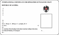 - ↑ a b International Certificate for Operators of Pleasure Craft - Resolution No. 40, Revision 4 and Amendments 1 to 3 (consolidated version), ECE/TRANS/SC.3/147/Rev.4 and Amends. Economic Commission for Europe - Inland Transport Committee, Working Party on Inland Water Transport, 2022.