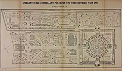 Die Ausstellung war in eine historische Fachausstellung und eine gewerbliche Special-Ausstellung gegliedert. Die Fachausstellung war zwar international angelegt, aber die deutsche und die nicht davon abgegrenzte österreichisch-ungarische Abteilung dominierten die Schau. „Interieurs mit den Reliquien der Tonheroen“ waren dort zu sehen. Mozart, Beethoven, Weber, Meyerbeer, Schumann, Mendelssohn-Bartholdy und Liszt führten sie an. Richard Wagner hatte mit der „Gibichungenhalle“ ein eigenes Gebäude, in dem die Legitimität deutscher Fürstengeschlechter mit mythologischen Fabelgestalten untermauert wurde. Die Regierungszeit des Kaisers Franz Joseph I. wurde in der Ausstellung als kulturell erfolgreiche Epoche dargestellt und die Vorherrschaft Wiens behauptet, das „unter Tönen und Accorden die singende Seele des deutschen Volkes geworden“ sei.[3] Wien solle damit zum „friedlichen Kampfplatz künstlerischen Wetteifers“ werden, wie sich die Neue Freie Presse anlässlich der Eröffnung ausdrückte. Im Hintergrund stand die Konkurrenz der seit der Reichsgründung rasant gewachsenen Stadt Berlin.