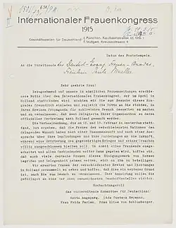 Für 1915 war auch eine Konferenz der Internationalen Vereinigung für Frauenstimmrecht in Berlin geplant, die aber kriegsbedingt nicht stattfinden konnte. Stattdessen lud die niederländische Sektion unter Leitung von Aletta Jacobs, Rosa Manus und Mia Boissevain zu einem Internationalen Frauenkongress nach Den Haag ein.