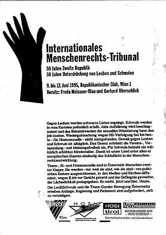 - ↑ a b c d e f g Tribunal erhebt Anklage gegen Staat. In: Der Standard, 10. Juni 1995: „Ein Internationales Menschenrechts-Tribunal erhob Freitag im Republikanischen Club Anklage gegen Österreich: Lesben, Schwule und Transsexuelle würden unterdrückt, geltende "Homosexuellen-Gesetze" seien diskriminierend, die Republik verstoße gegen Menschenrechte. Als Verteidiger Österreichs erschien SP-Nationalratsabgeordneter Hannes Jarolim (Bild links). Ihm folgt als Anklägerin Elisabeth Piesch, Vater von zwei Kindern. Daneben die Senats-Vorsitzenden Gerhard Oberschlick und Freda Meissner-Blau, flankiert von Moderatorin Waltraud Riegler. Ihr schließen sich weitere Vertreter der Anklage an: Gudrun Hauer von der feministischen Zeitschrift Anschläge, Christian Michelides, Vorsitzender des Österreichischen Lesben- und Schwulenforums, Kurt Krickler und Roman Fischer von der Homosexuelleninitiative. Der leere Sessel ist Zeugen vorbehalten, Michelides Hund Bobbi überwacht argwöhnisch den Saal. Das Tribunal tagt noch bis zur Urteilsverkündung am kommenden Montag, zu der Liberalen-Chefin Heide Schmidt erwartet wird. (fei) Foto: Semotan“. (Anmerkung: Heide Schmidt war nicht wie angekündigt bei der Urteilsverkündung erschienen, sondern war dann erst beim Appell an die Vernunft, veranstaltet vom ÖLSF am 29. Juni 1995 im Palais Auersperg anwesend.)