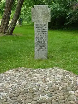 - ↑ Inschrift des Gedenkkreuzes auf der Gedenkstätte für die Opfer des Nachkriegslagers: „DEUTSCHEN UND POLEN OPFERN DES LAGERS LAMSDORF IN DEN JAHREN 1945–1946“ (auch in Polnisch), eingeweiht am 30. September 1995, siehe Edmund Nowak 2003 (Literatur), S. 249: „ein Denkmal in Gestalt eines schlesischen Sühnekreuzes“
