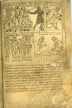 Schon bald nach der Beilegung des Konflikts im sogenannten „Wormser Konkordat“ von 1122 (in dem sich der Kaiser dazu bereit erklärte, auf die Investitur mit Ring und Stab zu verzichten).[10] und der innerkirchlichen Anerkennung des Friedensabkommens auf der Fastensynode vom März 1123 bedienten sich einige zeitgenössische Autoren, darunter auch der englische Geschichtsschreiber Wilhelm von Malmesbury († um 1143), des heute noch gebräuchlichen Begriffs „Investiturstreit“ (investiturae controversia), um die gerade erst beendete Kontroverse zwischen Sacerdotium und Imperium zu beschreiben.[23] Damit „rückten [sie] das Investiturproblem als den gesamten Konflikt dominierend in Vordergrund“,[24] obgleich der Investiturfrage im Streit zwischen Kaisertum und Papsttum erst in einer späten Phase des Streits eine besondere Bedeutung zugekommen war.[25] und Papst „Calixt II. […] eine andere Deutung fixiert sehen [wollte]“.[26]