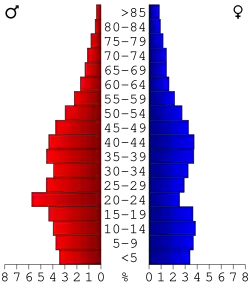 26,9 Prozent der Bevölkerung waren unter 18 Jahre alt. 11,5 Prozent zwischen 18 und 24 Jahre, 31,0 Prozent zwischen 25 und 44 Jahre, 20,5 Prozent zwischen 45 und 64 Jahre und 10,0 Prozent waren 65 Jahre oder älter. Das Durchschnittsalter betrug 33 Jahre. Auf 100 weibliche Personen kamen 115,2 männliche Personen. Auf 100 Frauen im Alter von 18 Jahren und darüber kamen statistisch 120,4 Männer.