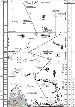 Die Ionosphäre der Erde beeinflusst den Funkverkehr, indem sie Kurzwellen reflektiert und damit weltweite Verbindungen ermöglicht. Außerdem dämpft sie die Ausbreitung von Radiowellen mit großer Wellenlänge. Sie beginnt oberhalb der Mesosphäre in einer Höhe von ungefähr 80 km, erreicht ihre größte Elektronendichte in einer Höhe um die 300 km und geht letztlich in den interplanetaren Raum über.[1] Als Grenze zwischen Ionosphäre und Plasmasphäre kann die sogenannte Übergangshöhe betrachtet werden, bei der die Konzentration von ionisiertem, atomarem Sauerstoff (O+) und Protonen (Wasserstoff-Ionen H+) gleich ist. Sie wird gewöhnlich auf eine Höhe von 1000 km festgelegt.[2] Dort erhöht sich die Skalenhöhe, mit der die Teilchendichte exponentiell abnimmt. Die Ionosphäre liegt somit größtenteils innerhalb der mit Blick auf Neutralteilchen definierten Thermosphäre.