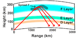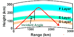 Vertikales Ausbreitungsverhalten zweier Funksignale unterschiedlicher Frequenz. Die niedrigere des rechten Signals wird in der E-Schicht reflektiert, die höhere des linken durchdringt die E-Schicht, bleibt aber niedriger als die kritische Frequenz der F-Schicht, weshalb sie in dieser Schicht reflektiert wird.