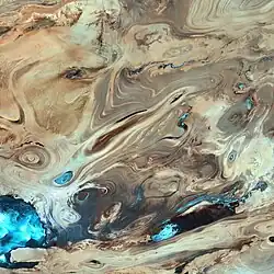 Zwei Drittel des Territoriums werden nicht in Richtung eines Meeres entwässert. In den ariden Becken des iranischen Hochlandes führt kaum ein Fluss ganzjährig Wasser, wie der Zayandeh Rud. Nach Niederschlägen fließt das Wasser durch Flüsse oder Bäche aus dem Gebirge und versickert dort meist in Schotterfeldern, seltener mündet es in Seen, die dann häufig salzhaltig sind. Zu solchen Seen gehören der Urmiasee, der Hamun-See, der Bachtegansee und der Maharlu-See.[19]