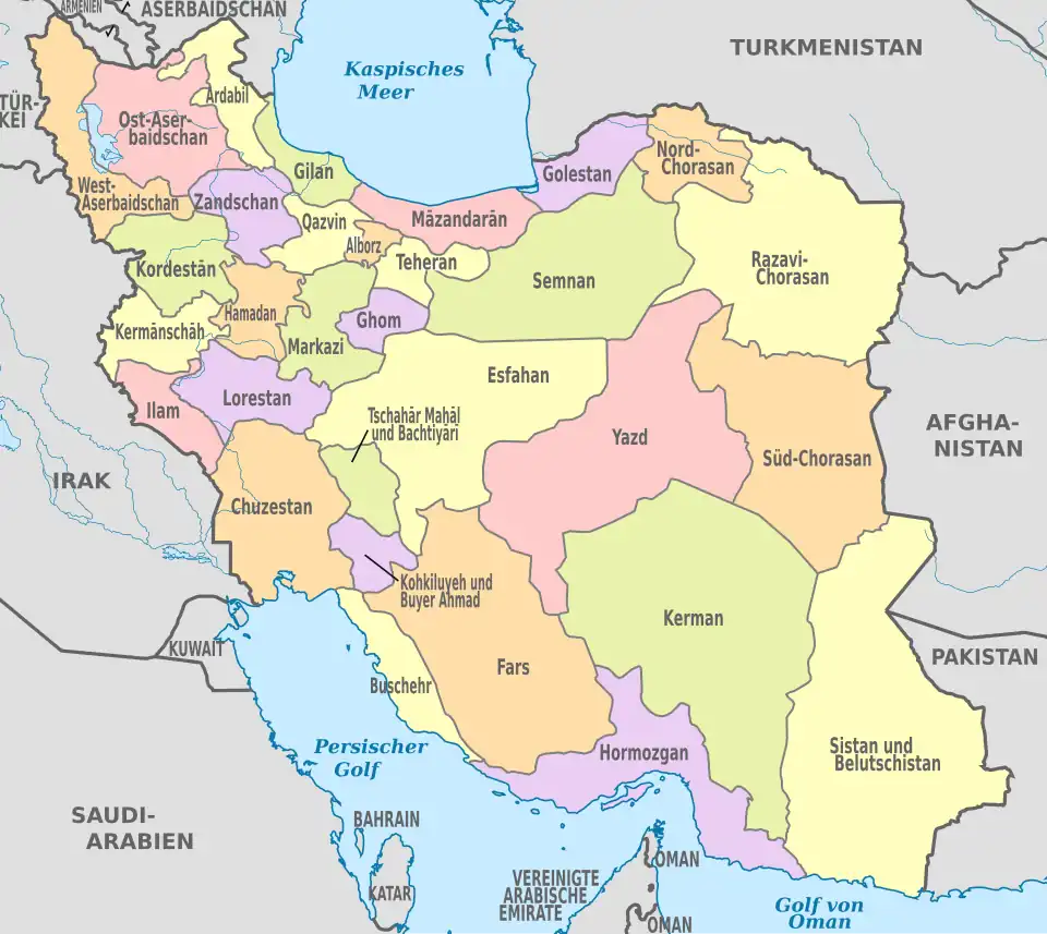 Im Jahr 2006 gab es in Iran 30 Ostans, 336 Schahrestans, 889 Bachschs, 1016 Städte (شهر Schahr) und 2400 Gemeinden (دهستان Dehestan).[48] Am 23. Juni 2010 wurde aus dem nordwestlichen Teil der Provinz Teheran die neue Provinz Alborz geschaffen, womit Iran nun aus 31 Provinzen besteht.