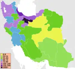 Iran hat heute eine Einwohnerzahl, die etwa jener Deutschlands entspricht, die sich jedoch auf ein viereinhalb Mal so großes Territorium verteilt. Die durchschnittliche Bevölkerungsdichte beträgt somit 46 Einwohner/km². Die Verteilung der Einwohner ist jedoch sehr ungleichmäßig. Die Gebiete, die hinsichtlich ihrer Klima- und Umweltbedingungen bevorzugt sind, weisen eine sehr hohe Bevölkerungsdichte auf, etwa die Provinzen am Kaspischen Meer (Gilan und Mazandaran mit 177 bzw. 129 Einwohner/km²) und entlang des Alborz (Provinzen Teheran und Alborz mit 890 bzw. 471 Einwohner/km²). Demgegenüber sind die von Wüsten geprägten Landstriche äußerst dünn oder gar nicht besiedelt: In Semnan, Süd-Chorasan und Yazd leben nur 6, 7 bzw. 8 Menschen auf einem Quadratkilometer.[63][64]
