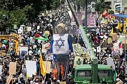 Trotz Modernisierung und einer 50 Jahre dauernden Säkularisierung unter den Pahlavi ist die Islamische Republik Iran heute ein Staat, in dem die Religion fast jeden Aspekt des sozialen Lebens durchdringt.[83] Die Abkehr vom Islam (selbst eine Konversion zum sunnitischen Islam wird so gewertet) kann mit dem Tode bestraft werden.[84] Offiziell (Volkszählung 2011) sind 99,4 % der Bürger Irans Muslime.[85] 2006 wurde geschätzt, dass sich 89 % bis 95 % der Iraner der Staatsreligion der Zwölfer-Schia und 4 % bis 10 % dem sunnitischen Islam zuordnen.[80] Die Bahai gelten als größte nichtmuslimische Religionsgemeinschaft.[86][87] Nicht-religiöse Iraner werden von der Regierung offiziell nicht als solche erfasst. Um viele staatsbürgerliche Rechte wahrnehmen zu können, muss man sich zu einer der vier anerkannten Religionen bekennen.[88] Im Jahr 2024 erhielt Iran von Freedom House eine Bewertung von null von vier Punkten für Religionsfreiheit.