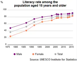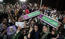 Ursache des starken Bevölkerungswachstums war vor allem die deutlich gestiegene Lebenserwartung: Anfang des 20. Jahrhunderts wurden die Menschen im Schnitt knapp 30 Jahre alt und die Kindersterblichkeit lag bei 50 %.[53] Die Lebenserwartung der Einwohner Irans ab der Geburt lag 2020 bei 74,8 Jahren[55] (Frauen: 77,8[56], Männer: 72,1[57]). Außerdem verharrte die Geburtenrate lange auf sehr hohem Niveau: im Jahr 1956 bei durchschnittlich 7,9 Kindern und im Jahr 1986 bei 6,39 Kindern pro Frau.[58] Doch ist sie seither stark gesunken. Die Anzahl der Geburten pro Frau lag 2022 statistisch bei 1,7.[59] Nur in Japan nach dem Zweiten Weltkrieg gab es einen schnelleren Rückgang der Fertilitätsrate.[60] So hat sich das Bevölkerungswachstum in Iran verlangsamt; im Jahr 2023 betrug es noch 0,7 %.[61] Diese Bevölkerungsentwicklung mündete in eine im Durchschnitt zwar nach wie vor sehr jungen, aber stetig alternden Bevölkerung. Während der Median des Alters der Bevölkerung im Jahr 1975 noch bei 18,6 Jahren lag, betrug er im Jahr 2021 31,9 Jahre.[62] Seit 1976 stieg die Anzahl der Haushalte überproportional: Die durchschnittliche Größe eines iranischen Haushaltes sank von fünf Personen im Jahr 1976 auf 3,5 Personen im Jahr 2011.[63]