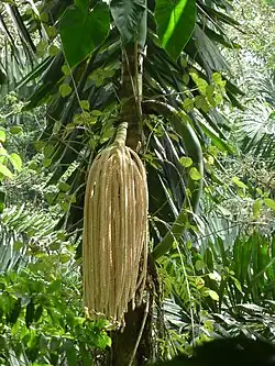 Die Blütenstände stehen einzeln und unter den Blättern (infrafoliar). Sie hängen, sind bis 2 m lang[2] und sind im Knospenstadium stark gekrümmt. Sie sind ein- bis zweifach verzweigt, die männlichen Blüten öffnen sich zuerst (Proterandrie). Der Blütenstandsstiel ist dick und im Querschnitt rund. Das Vorblatt ist kurz, röhrig, zweikielig und an der Spitze offen. Es gibt 8 bis 12 Hochblätter am Blütenstandsstiel. Sie stehen spiralig, sind röhrig, umhüllen den Blütenstand und hinterlassen nach dem Abfallen auffällige, fast ringförmige Narben. Die Blütenstandsachse ist gleich lang wie oder etwas länger als der Stiel, sie trägt spiralig stehende, kleine, kragenartige Hochblätter. Die Seitenachsen erster Ordnung sind im distalen Bereich des Blütenstands fingerförmig verzweigt, an der Spitze des Blütenstands unverzweigt. Sie sind sehr lang und tragen in spiraliger Anordnung Blüten-Triaden. An der Spitze der Achsen sind diese zu einzelnen oder paarigen männlichen Blüten reduziert.