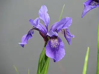 Das Rhizom ist kriechend und dick. Die Blätter sind auf beiden Seiten gräulich grün, linealisch und 15 bis 45 Zentimeter × 3 bis 10 Millimeter groß. Eine Mittelrippe fehlt. Die Blattbasis ist rötlich. Die Stängel sind 10 bis 40, selten bis 70 Zentimeter × 4 bis 6 Millimeter groß, hohl und zwei- oder dreiblättrig. Die 2 oder 3 Spathas sind grün, am Rand leicht rötlich, 5,5 bis 12 × 0,8 bis 1,2 Zentimeter groß und selten ein-, meist zweiblütig. Die Blüten sind schwach lila oder bläulich violett bis dunkel violett, seltener weiß und haben einen Durchmesser von 6,5 bis 7,5 Zentimeter. Die Blütenstiele sind 2 bis 6 Zentimeter lang. Die Perigonröhre ist 1 bis 1,2 Zentimeter lang. Die Hängeblätter sind verkehrteiförmig, 4,5 bis 5 × ungefähr 2,5 Zentimeter groß und weisen auf einem zentralen, weißlichen oder gelblichen Flecken dunkle Linien und Musterungen auf. Die Domblätter sind mehr oder weniger stark aufrecht, hell violett, lanzettlich und ungefähr 4 bis 1,5 Zentimeter groß. Die Staubblätter sind ungefähr 2,5 Zentimeter groß, die Staubbeutel milchig weiß. Der Fruchtknoten ist ungefähr 2 Zentimeter groß. Die Griffeläste sind ungefähr 3,5 Zentimeter groß. Die Kapsel ist 4 bis 5,5 × 1,5 bis 1,8 Zentimeter groß, zylindrisch, dreieckig, erkennbar 6-aderig, Stumpf und nicht an der Spitze geschnabelt. Die Samen sind halbkugelförmig, flach und braun.