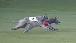 Zwei Irische Wolfshunde beim Coursing mit Renndecken und Maulkorb