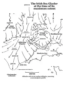 Forschungen von 2007[4] sprechen auch dafür, dass das Gebiet jenseits der South Ireland End Moraine während und nach der letzten großen Vereisung durch einen Irischen Eisschild bedeckt war, genauso wie Teile der Gebiete jenseits der South Wales End Moraine.