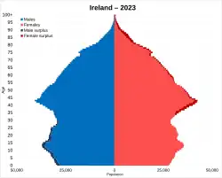 Irland hatte 2023 5,3 Millionen Einwohner.[14] Das jährliche Bevölkerungswachstum betrug + 2,6 %. Zum Bevölkerungswachstum trug ein Geburtenüberschuss (Geburtenziffer: 11,2 pro 1000 Einwohner[15] vs. Sterbeziffer: 6,9 pro 1000 Einwohner[16]) bei. Die Anzahl der Geburten pro Frau lag 2022 statistisch bei 1,7, die der Europäischen Union betrug 1,5.[17] Die Lebenserwartung der Einwohner Irlands ab der Geburt lag 2022 bei 83,1 Jahren[18]. Der Median des Alters der Bevölkerung lag im Jahr 2021 bei 37,6 Jahren.[19] Im Jahr 2023 waren 19,2 Prozent der Bevölkerung unter 15 Jahre,[20] während der Anteil der über 64-Jährigen 15,5 Prozent der Bevölkerung betrug.[21]