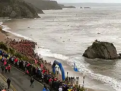 - Die Schwimmdistanz verläuft in Carmarthen Bay am Strand der Stadt Tenby. Die Sportler schwimmen zwei Runden auf einem 1,9-km-Rundkurs mit Landgang nach der ersten Runde.