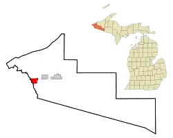 Die nächstgelegenen größeren Städte sind Sault Ste. Marie in der kanadischen Provinz Ontario (498 km ostnordöstlich, gegenüber von Sault Ste. Marie, Michigan), Green Bay am Michigansee in Wisconsin (351 km südöstlich), Wausau in Wisconsin (201 km südlich), die Twin Cities in Minnesota (361 km südwestlich) und Duluth am Oberen See in Minnesota (174 km westnordwestlich).[4]