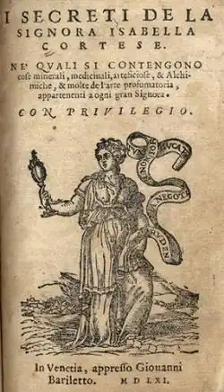 - I secreti de la Signora Isabella Cortese, ne’qvali si contengono cose minerali, medicinali, arteficiose, & alchimiche, & molte de l’arte profumatoria, appartenenti a ogni gran signora : con altri bellissimi secreti aggiunti. Giovanni Bariletto, Venedig 1561, 1565, Archive.