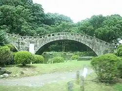 Die massive steinerne Doppelbogenbrücke wurde 1839 errichtet, um die vorherigen Brücken zu ersetzen, die bei den jährlichen Fluten des Honmyō beschädigt oder weggeschwemmt wurden. Sie wurde innerhalb von 18 Monaten nach dem Vorbild der Meganebashi in Nagasaki fertiggestellt und ist 49,25 m lang, 5,5 m breit und besteht aus 2800 Steinen.[1]