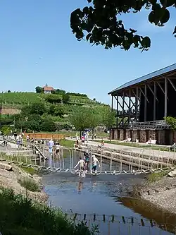 An der Nahtstelle zwischen der Isenach und dem aufgelassenen Frankenthaler Kanal befindet sich die alte Schleuse, die in der zweiten Hälfte des 20. Jahrhunderts zum Rückhaltebecken für den Fall von Hochwasser ausgebaut wurde.