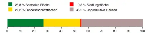 Es besteht zu 26,8 % aus bestockter Fläche, zu 27,2 % aus Landwirtschaftsfläche, zu 0,8 % aus Siedlungsfläche und zu 45,2 % aus unproduktiven Flächen.