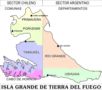 Politisch zählt die Insel auf chilenischer Seite zur Región de Magallanes y de la Antártica Chilena (Provinzen Tierra del Fuego und teils Antártica Chilena), auf argentinischer Seite zur Provinz Tierra del Fuego (Departamentos Río Grande, Tolhuin und Ushuaia).