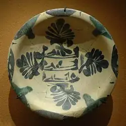 Hauptsächlich verwendet wurden Fayencen für offenes Tafelgeschirr und für vegetabile, geometrische und kalligraphische Motive. Die für viele Keramiken typische Blaufärbung wurde durch die Verwendung von Kobaltpigmenten erreicht, einer Technik, die ursprünglich in Basra ausgebildet worden war und sich schnell auch in Syrien und Ägypten verbreitete.[11] Die Fayencen aus dem abbasidischen Kernland wurden auch in Persien und im Maghreb kopiert, doch wurde hier bevorzugt mit grünlichen Farben gearbeitet.[12] Nicht selten übertrafen die keramischen Kunstwerke aus den Provinzen dabei auch ihre Vorbilder aus Mesopotamien: Die unter samanidischer und tahiridischer Herrschaft in Afrasiab und Nischapur hergestellten Dekorationen etwa entstanden auf Basis sorgfältiger Planung mithilfe von Papierentwürfen, wodurch die kalligraphischen Inschriften auf den Töpferwaren sehr viel eleganter und stilsicherer ausgeführt werden konnten.[13]
