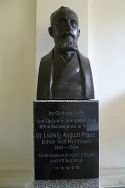 Im Rahmen einer Gedenkveranstaltung am 26. Jänner 2006 wurde die lang verschollene Büste des Gründers Ludwig August Frankl erneut enthüllt. Die von Heinrich Hahn gefertigte Büste aus schwarzem Marmor war anlässlich des 100. Geburtstag Frankls 1910 im Vorgarten des Israelitischen Blindeninstituts aufgestellt worden.[17][18] Die Verwaltung des Reichsgaues Wien, Hauptabteilung E, Gesundheitswesen, hatte im April 1943 die im Haus aufgefundene Schlusssteinurkunde aus dem Jahr 1871, Pläne und Druckschriften sowie am 18. Mai die Büste an die Städtischen Sammlungen überwiesen, die durch Empfehlung der Wiener Restitutionskommission 2003 an die IKG Wien als Rechtsnachfolgerin des Israelitischen Blindeninstitutes Hohe Warte gegeben wurden.[2] Auf dem Sockel steht die Inschrift: