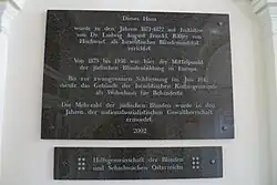 Am 15. Oktober 2002 wurde auf Initiative der Hilfsgemeinschaft der Blinden und Sehschwachen Österreichs eine Gedenktafel enthüllt, die an die Geschichte des Israelitischen Blindeninstituts erinnert.[9][16] Sie trägt die Inschrift: