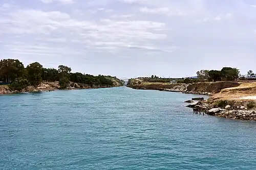Seit dem Altertum diente diese Stelle nicht nur für die Querung zur Peloponnes auf dem Landwege, sondern auch zur Abkürzung der Schifffahrtsroute vom Saronischen Golf zum Golf von Korinth. Schon Thukydides berichtet, dass die Landenge für einen Schiffskarrenweg benutzt wurde, um Wasserfahrzeuge von der einen zur anderen Seite auf Karren verladen zu transportieren. Ende des 19. Jahrhunderts wurde an der schmalsten Stelle der Landenge, nur etwa 6,4 Kilometer breit, ein 1893 vollendeter Kanal gebaut, der Kanal von Korinth.