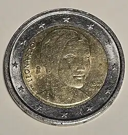 - 2 Euro: Porträt Dante Alighieris, Detail des 1509/10 von Raffael geschaffenen Wandfreskos „Disput über das Sakrament“ in der Stanza della Segnatura des Apostolischen Palastes,[10] Entwurf von Maria Carmela Colaneri.[11]