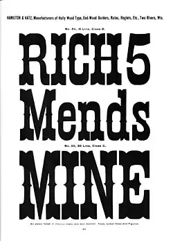 Während die ursprünglichen Italienne-Schriften zum Teil auch in der Mitte der Glyphen (etwa im Querstrich des Buchstabens H) dicke Striche haben, sind bei French Clarendon-Schriften durchgehend nur die oberen und unteren Querstriche dick. Die Serifen sind zurückhaltender gestaltet und es gibt keine um 90 Grad gedrehten dreieckigen Serifen mehr.[8] Die Glyphen sind außerdem tendenziell schmal und hoch. Diese neuen Italienne-Schriften boten den Vorteil, dass die großen Serifen den Blick einfingen, während die schmalen Buchstaben den Bedürfnissen des Plakatdrucks entgegenkamen. Sie sind diejenigen, die in Europa vor allem unter dem Namen Italienne bekannt sind. Sie werden hauptsächlich mit Drucksachen aus dem Wilden Westen[9][10] sowie mit Theater- und Zirkusplakaten assoziiert.