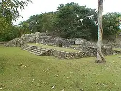 Dominiert wird das Zeremonialzentrum durch vier große und hohe Bauten, die als Tempelpyramiden, die aber auch als Maya-Akropolis aufgefasst werden können, da sie auf einer oder mehreren Seiten in mittlerer Höhe große Plattformen einschließen, auf denen weitere Bauten stehen, die als Palast- oder Wohnbauten anzusprechen sind. Daneben finden sich sechs kleinere Bauten, zwei Ballspielplätze, 13 Altäre und drei Stelen. Die Treppen der Pyramiden wurden begleitet von großen Masken aus Stuck, die sich vergleichsweise gut erhalten haben, da sie von späteren Bauphasen überdeckt wurden. Über die Funktion einer nur ca. 1 m hohen runden Struktur kann letztlich nur spekuliert werden.