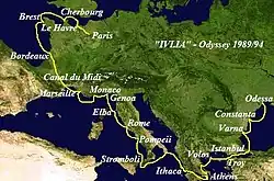 Ausgehend von Odessa (Ukraine) im Jahr 1989, folgte Ivlia den Routen der alten Seefahrern auf dem Schwarzen Meer und dem Mittelmeer sowie im Atlantik. Die Bireme segelte mehr als 3.000 Seemeilen in sechs Expeditionen. In dieser Zeit besuchte die Ivlia 50 europäische Städte und durchquerte ganz Europa, bis sie schließlich den Fluss Seine und als Endziel im Jahr 1994 die französische Hauptstadt Paris erreichte[4]. Die internationalen Medien veröffentlichten Hunderte von Artikeln über die Reise der Bireme rund um Europa.[5] Das Schiff wurde regelmäßig von offiziellen Delegationen und Tausenden von Touristen besucht. Ivlia nahm auch an internationalen maritimen Festivals: «Colombo'92» (Genua, Italien), «Brest'92»[6], «Cancale'93», «Vieux Greements'94» (Frankreich) teil, zum Team der Bireme gehörten mehr als 200 Besatzungsmitglieder – Bürger der Ukraine, der Russischen Föderation, Moldawien, Frankreich, Griechenland und Georgien.
