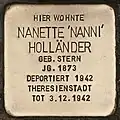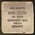 | Jeanette Adler | 1873 – ?? | Deportation in das KZ Theresienstadt, Tod vermutlich im KZ Auschwitz, genauer Todeszeitpunkt unbekannt | Hartmannstraße 5 |